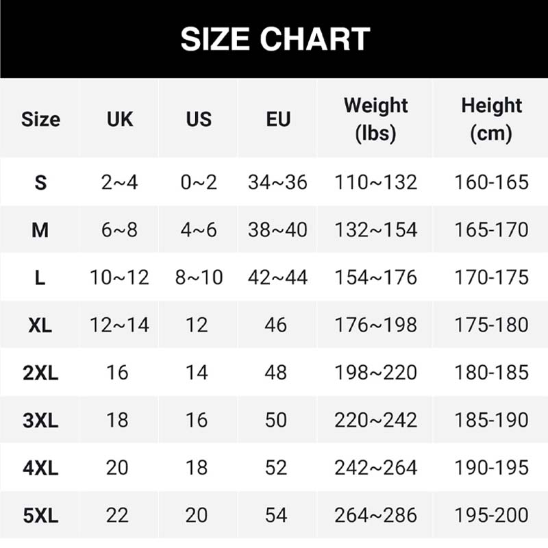 Taglie: S, M, L, XL, 2XL, 3XL, 4XL, 5XL